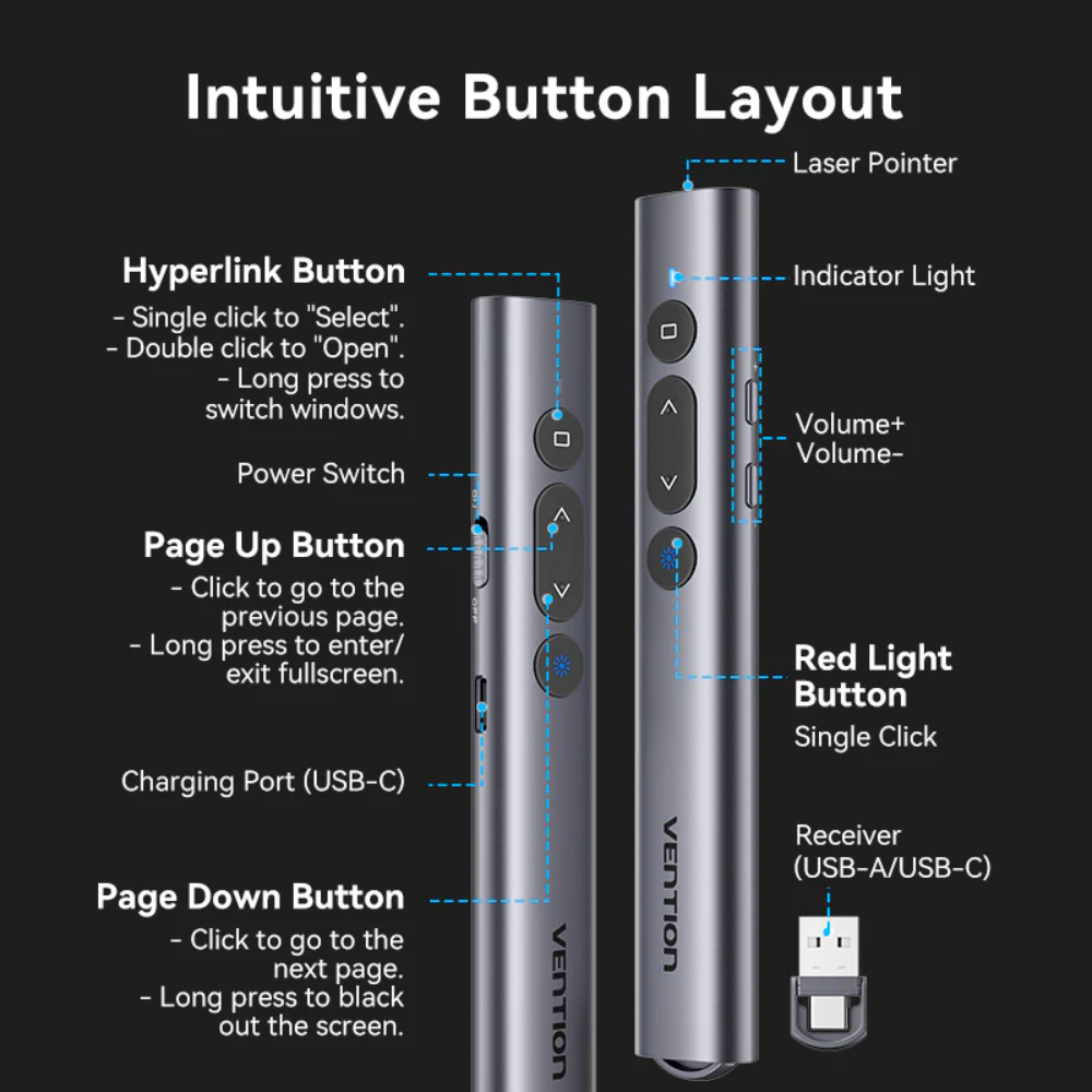 - فينشن KQJ جهاز تقديم لاسلكي بنقطة ليزر خضراء، مدى 100 متر، بمنفذي USB-A و USB-C