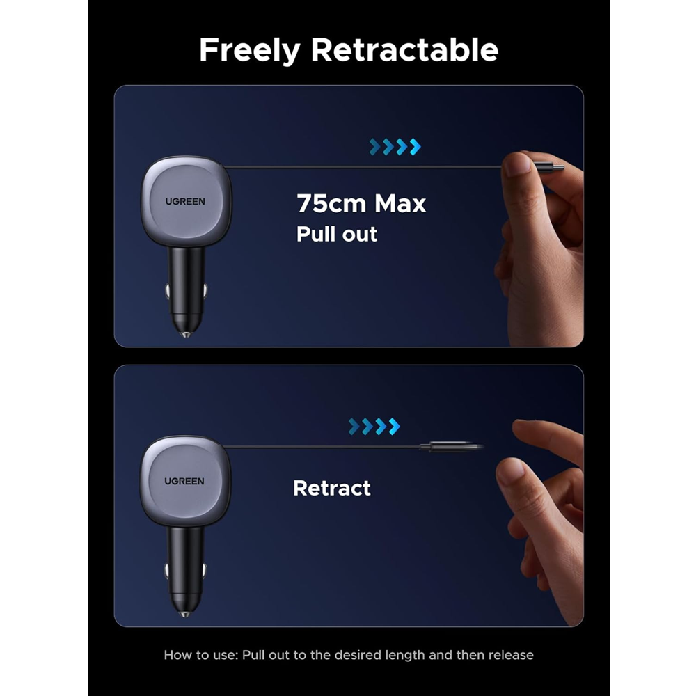 UGREEN EC601 75W Fast Car Charger Adapter with USB-C Retractable Cable